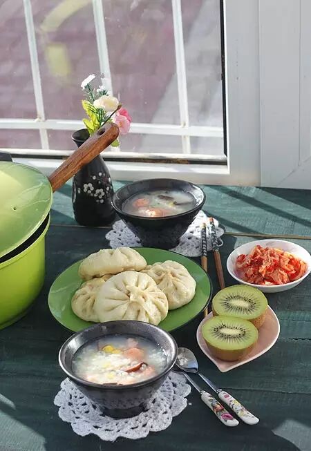 11、提前包好的白菜粉条馅包子,鲜虾滑玉米粥,辣白菜,还有水果猕猴桃!