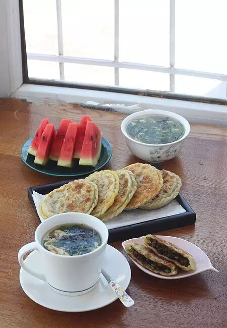 9、晚上用豆角肉末和橄榄菜做好馅,做好烫面团,冷藏保存,早晨起来做的榄菜豆角馅饼,煮了菠菜鸡蛋汤,水果是西瓜!
