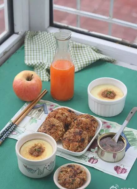 剩米饭蒸锅热透放入葱末、胡萝卜末、黄瓜末、再放入自制肉松和拌饭酱 拌匀后用保鲜膜做成团再轻轻一压就成了酱香米饼;果汁是苹果胡萝卜汁放了一些纯净水和蜂蜜!