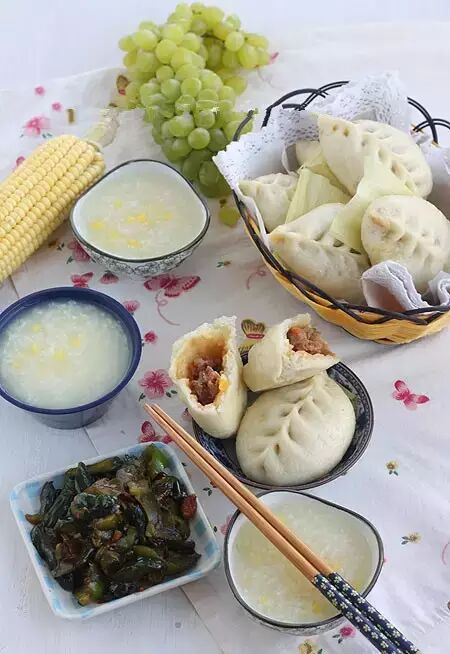 16、玉米鲜肉包、玉米大米粥、油黄瓜小菜,葡萄,肉包和小咸菜。