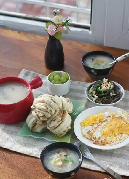 7、提前做好的葱油花卷,早晨起来热一下,晚上煮好的白粥,早晨起来放了新鲜的鲍鱼片和香菇调味,煎了蛋,凉拌了茄子!