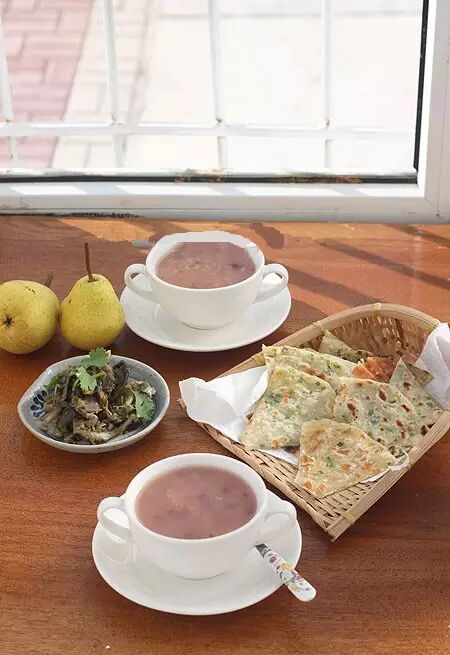 冷藏里还有一块剩的烫面团,于是烙了3张薄葱油饼,水果是大头梨;