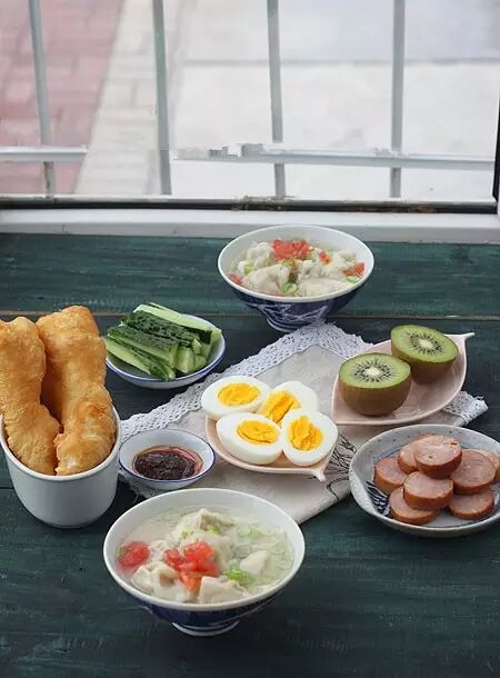 1、馄饨皮包馄饨;煮蛋,切了黄瓜蘸香其酱;散步的时候买的香肠,还有油条!