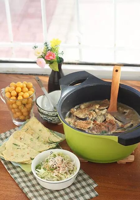 19、做了3个小茄子的茄粑子,因为面衣裹得好,所以做出来一小锅;盆里剩下点面糊又加了葱花一点面粉和水顺手煎了一张蛋饼;白菜丝葱花、虾皮拌了个小菜;水果是东北的黄菇茑。