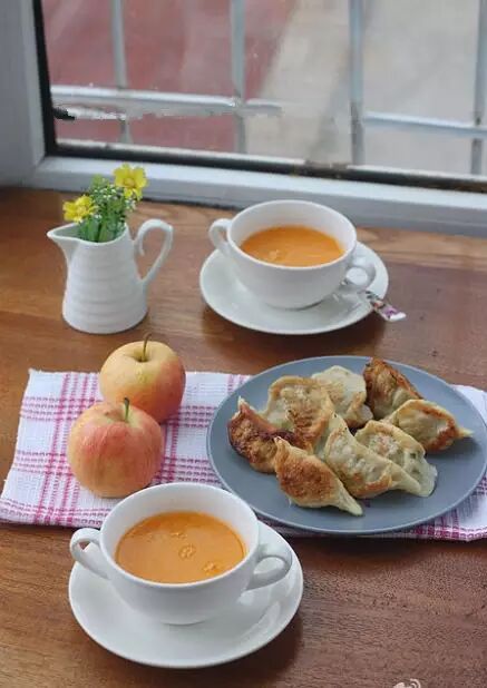 4、前一天晚上剩的芹菜肉和韭菜鸡蛋馅的饺子,早起用油煎了,晚上睡觉前抓一把大米泡上南瓜切小块,早起用豆浆机做的南瓜米糊,还有小苹果!