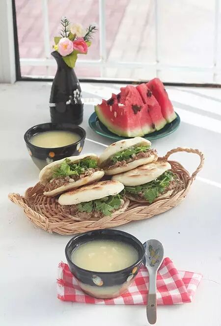 17、晚上翻冰箱看到一大块前几天买的猪肉,冷藏里还有几棵香菜,于是用高压锅酱了肉,剩下的连汤一起分成了小份以后用,睡前发了面,早晨做了肉夹馍、煮了麦片玉米粥,切几片西瓜!