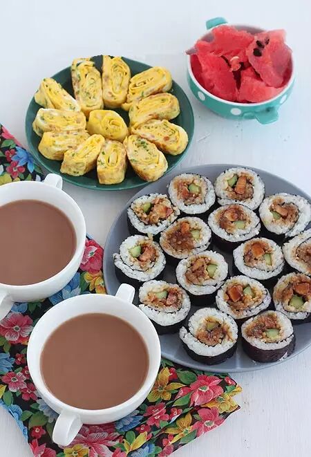 2、周末有时间用照烧鸡肉做的寿司卷,还做了厚蛋烧(香葱蛋卷饼)和奶茶 ,算是早午餐了。
