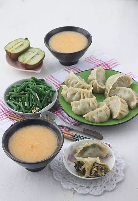 5、早晨起来下雨了,天空阴沉沉的,凉意越来越重了。剩了1把油菜,晚上热水焯了一下再加上粉丝和肉末葱花,早晨起来包了10多个烫面蒸饺,烫面是烙葱油饼剩的冷藏在冰箱里的;剩米饭锅底放了一块切碎的南瓜加水用豆浆机做的南瓜米糊;凉拌豇豆;一个猕猴桃,切开;